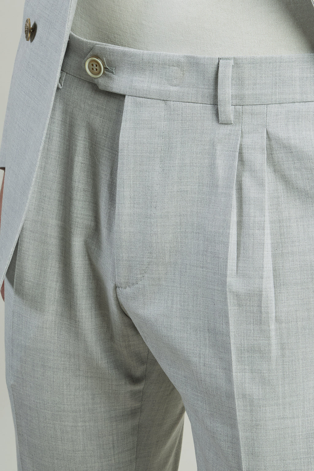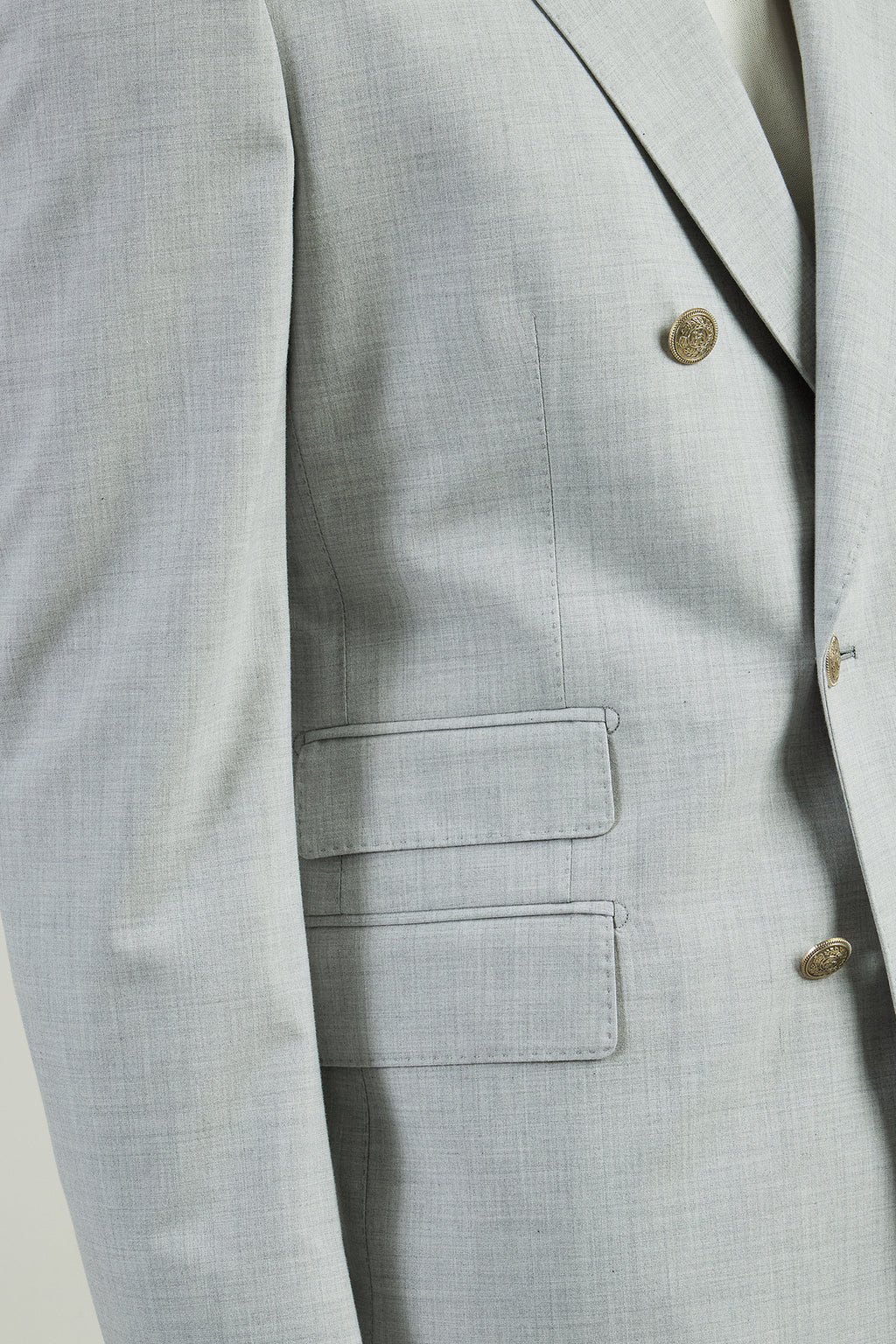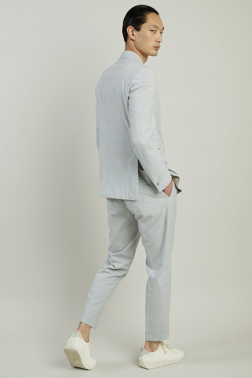Abito doppiopetto in lana, cotone e seta, dalla vestibilità slim. La giacca punta lancia e ticket pocket con pattina è abbinata al pantalone due pinces, più morbido sul bacino. Realizzato interamente in Italia con passaggi a mano che richiedono circa dieci ore di lavorazione, l’abito è caratterizzato da un bottone singolo sulla manica, segno distintivo del brand, ispirato alla tradizione della sartoria napoletana.