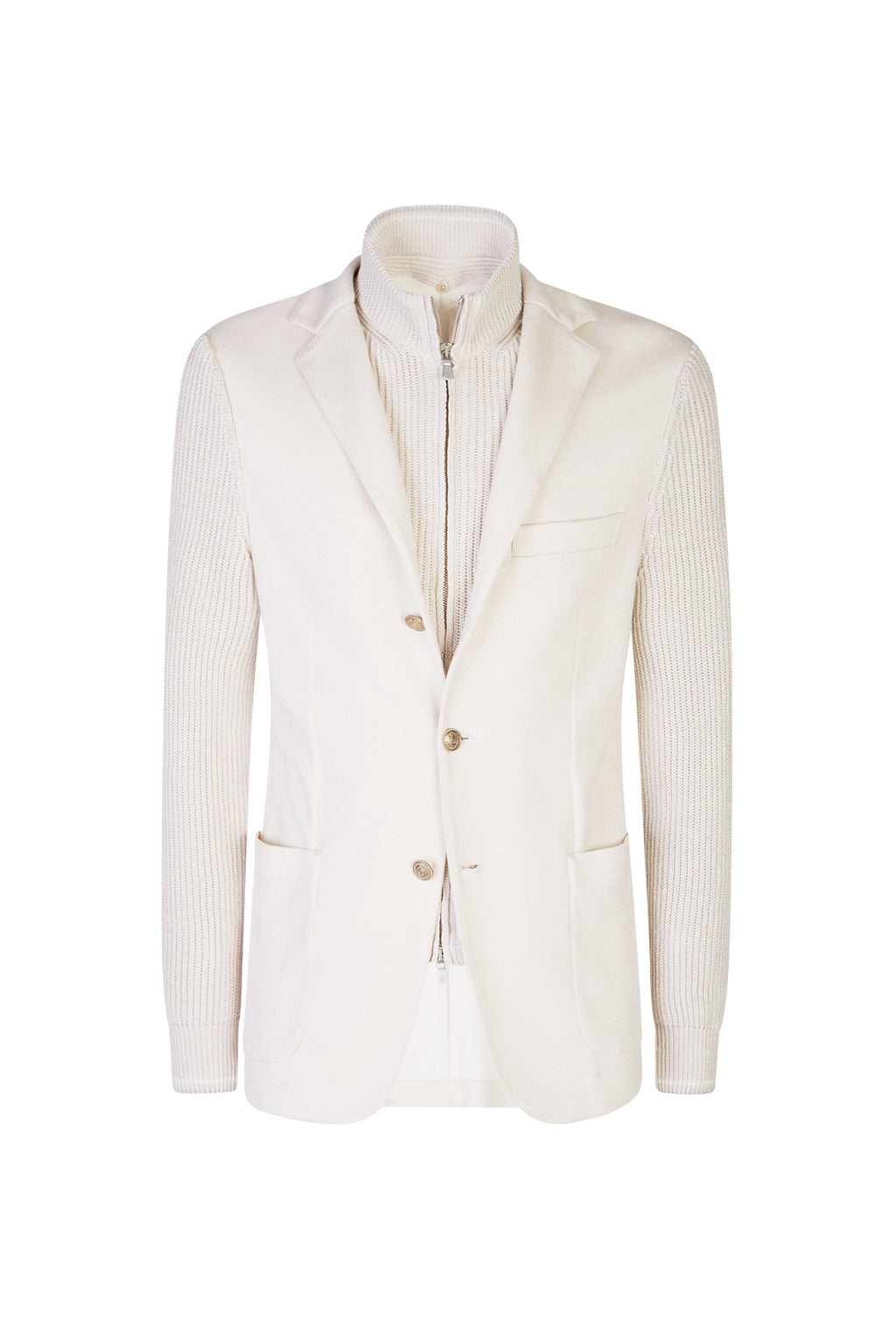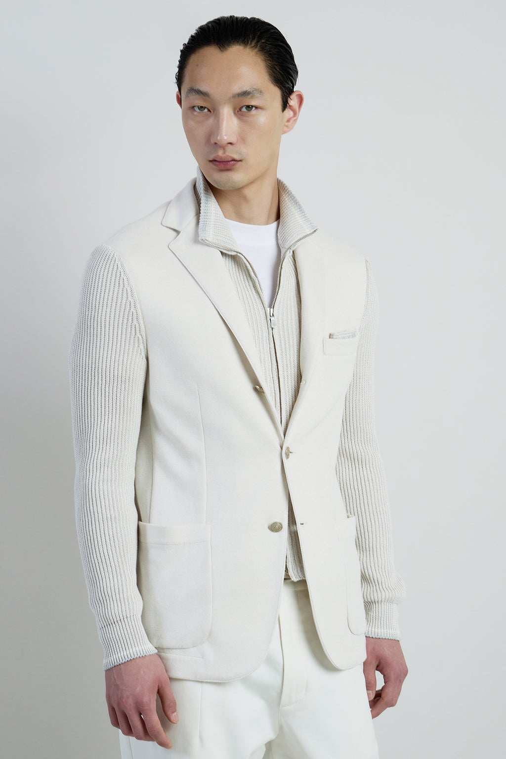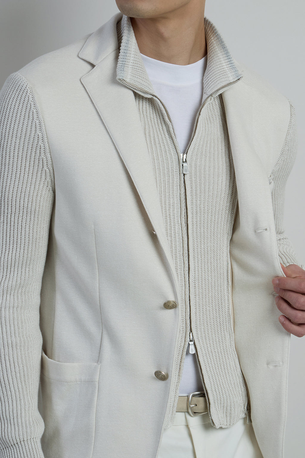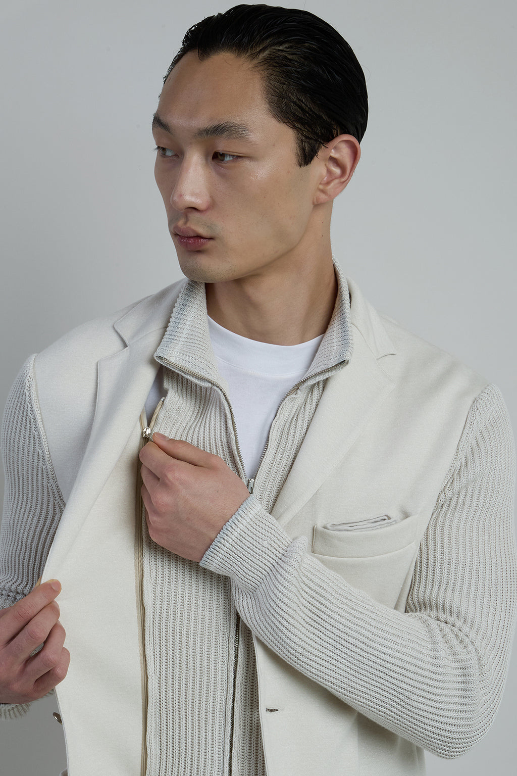 Giacca monopetto bimaterica con collo in piedi. Corpo e pettorina staccabile in jersey di cotone e lino con maniche in filato di cotone a costa inglese finezza 7. L'elasticità della maglia e del jersey conferiscono al capo una vestibilità che si adatta a qualsiasi corporatura, preservandone l’aspetto sartoriale.