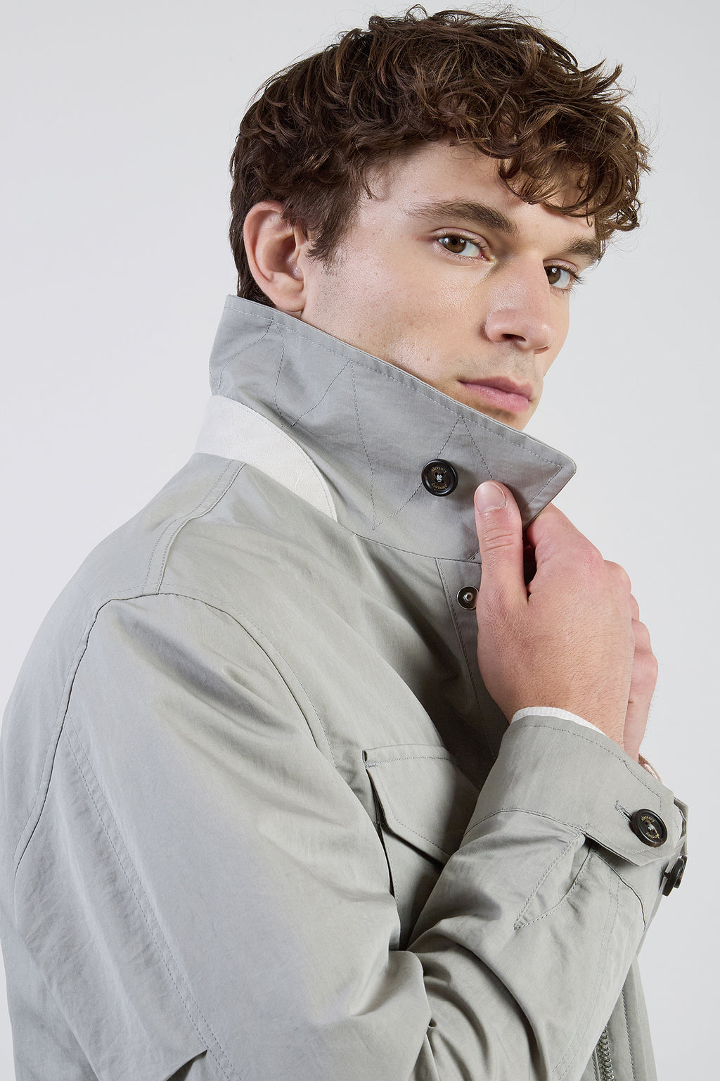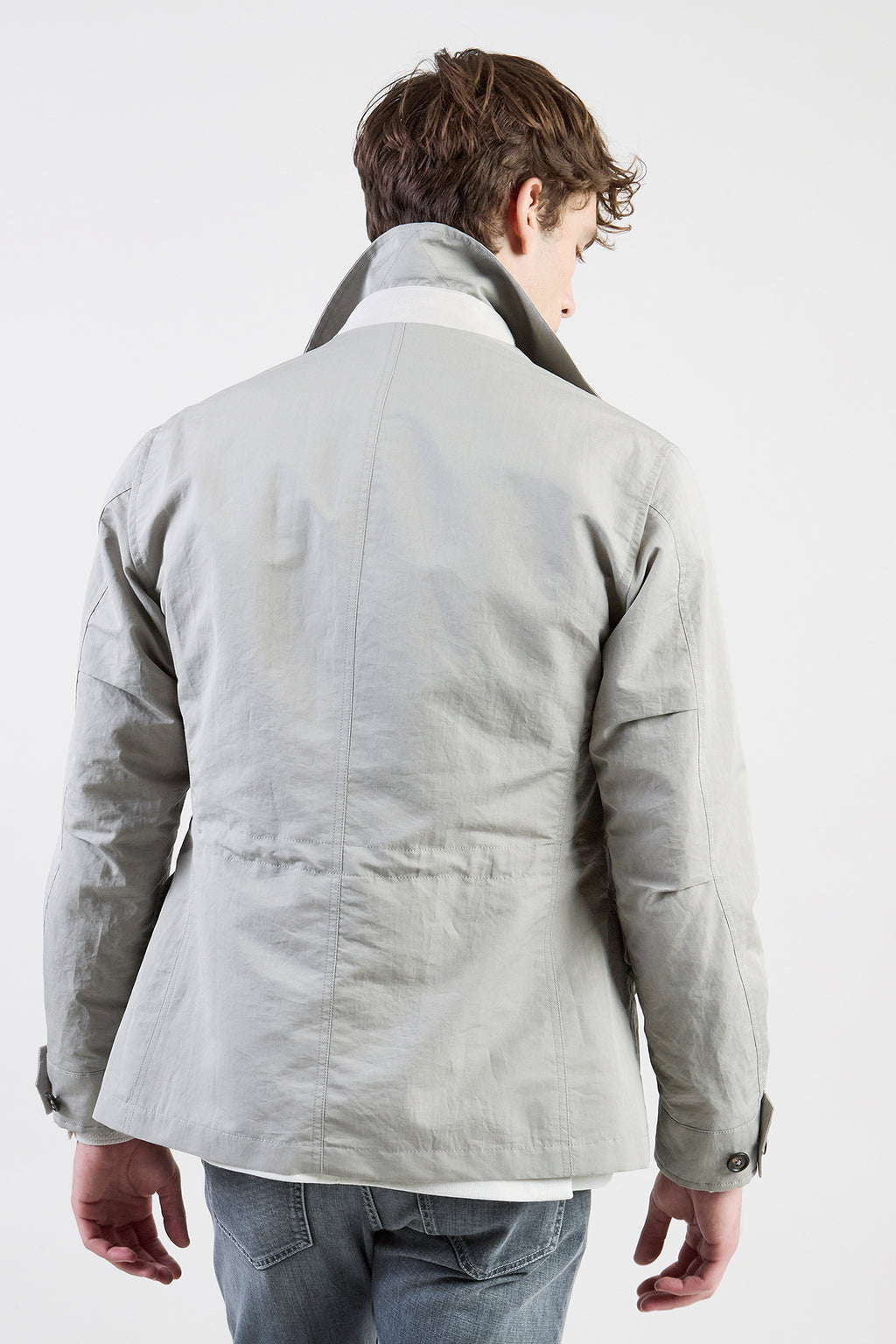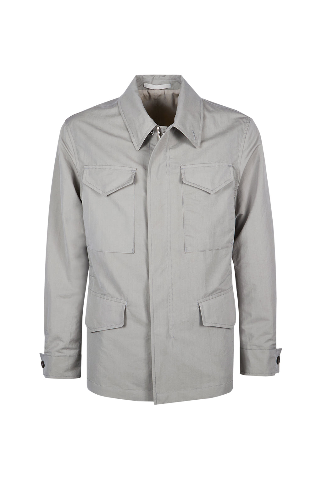 Giacca d'ispirazione sahariana in tessuto di cotone e seta. Capo dal sapore sportivo, ideale per la stagione primaverile, con bottoni automatici nascosti e dettagli in vellutato suede. Vestibilità regolare.