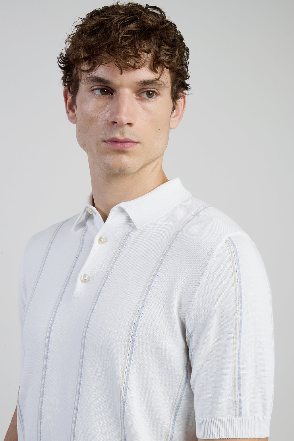 Polo in cotone Sea Island, finezza 18, effetto gessato. Questo filato, coltivato esclusivamente nelle isole caraibiche delle Indie Occidentali Britanniche, viene raccolto a mano, ed è una delle fibre più lunghe del mondo caratterizzata da resistenza e brillantezza, grazie all'incredibile finezza della fibra. Capo elegante senza tempo, con bottoni in madreperla e vestibilità regolare.Composizione