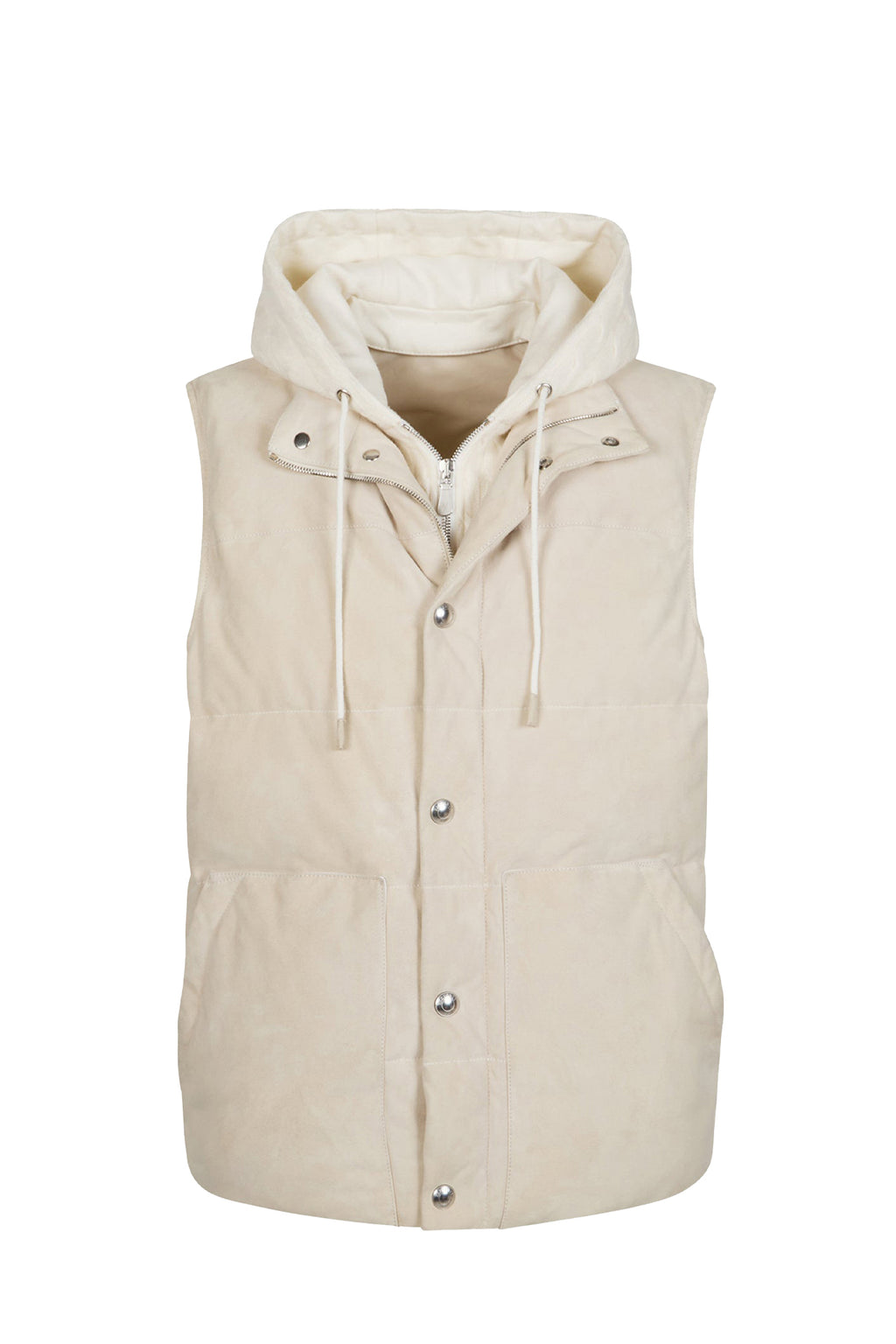 Gilet imbottito dalla vestibilità regolare, realizzato in vellutato suede. La calda imbottitura in piuma rende il capo ideale per la stagione invernale. Completa il capo la pettorina staccabile con cappuccio in jersey di lana e cashmere a treccia.