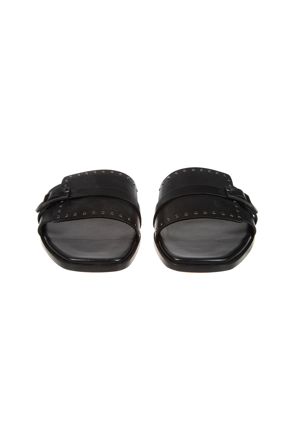 Ciabattina bassa con fascia, realizzata in nappa morbidissima e arricchita da dettagli in micro borchie. Il tocco esclusivo di una piccola fibia la rende ancora più particolare e raffinata, aggiungendo un elemento di stile unico al design semplice ma eleg