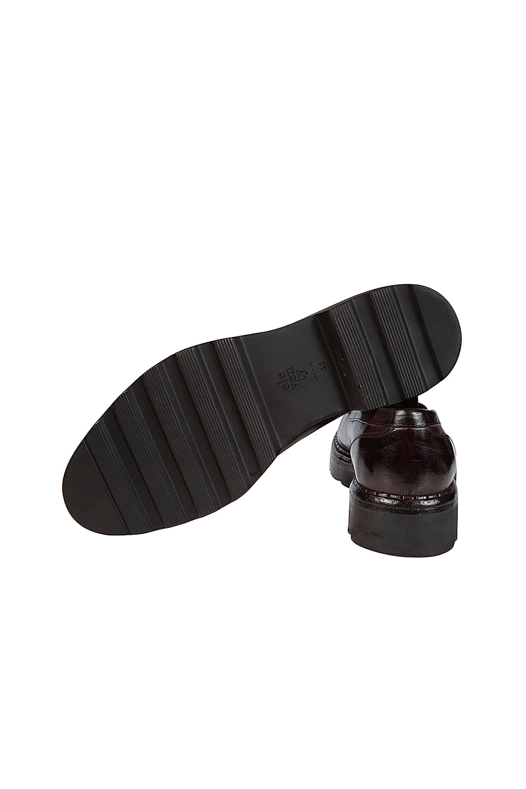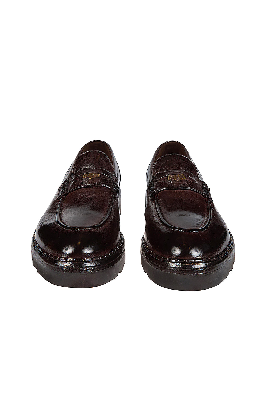 Mocassino Penny Loafer in pelle di bufalo. Monetina personalizzata da 20 cents da inserire nella fascia distintiva della calzatura. La tintura in capo eseguita a mano con ferri caldi, pomate e spazzole ad hoc crea sfumature uniche di colore, enfatizzando l'aspetto artigianale della calzatura. Suola leggera in gomma Eva con guardolo applicato.Composizione