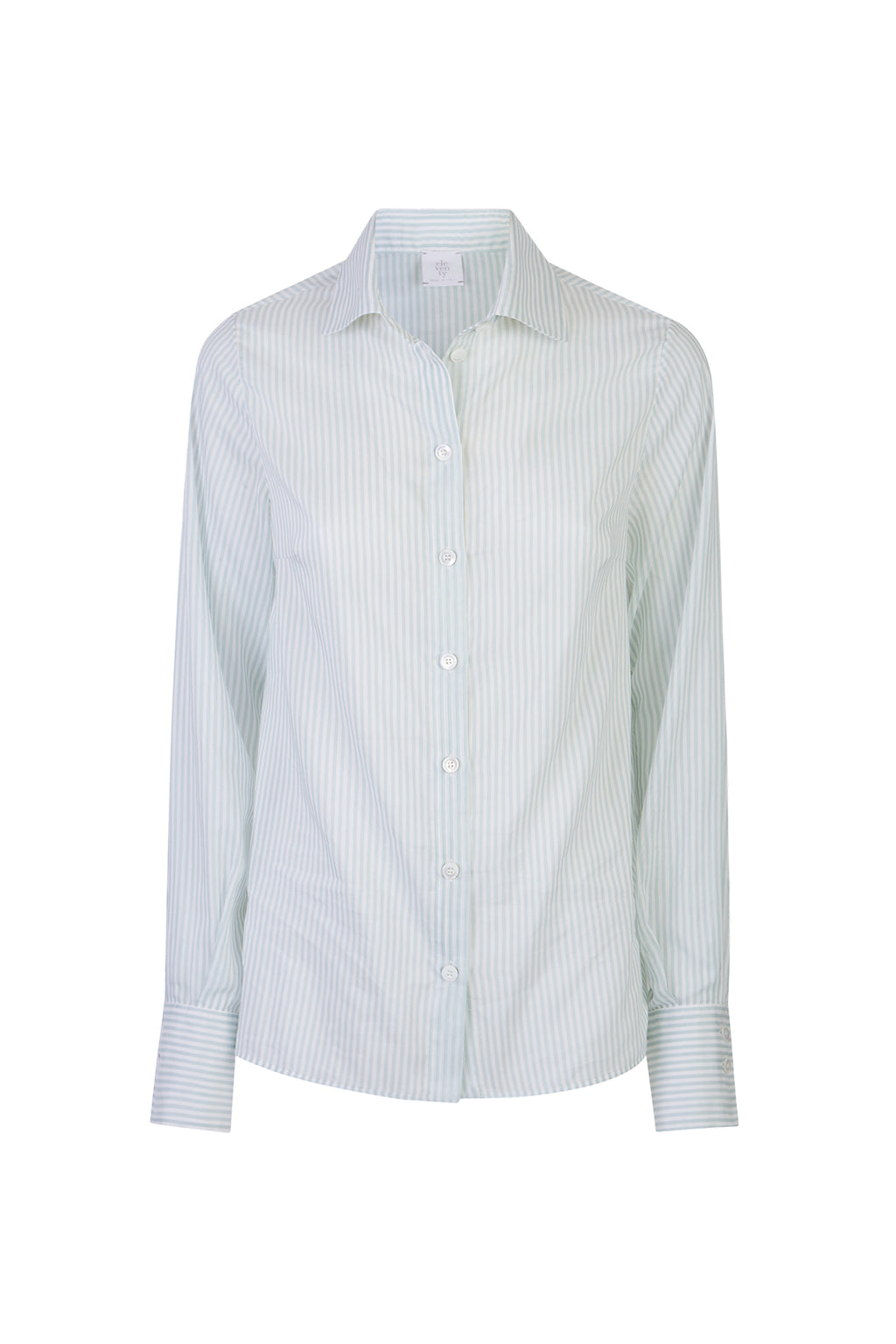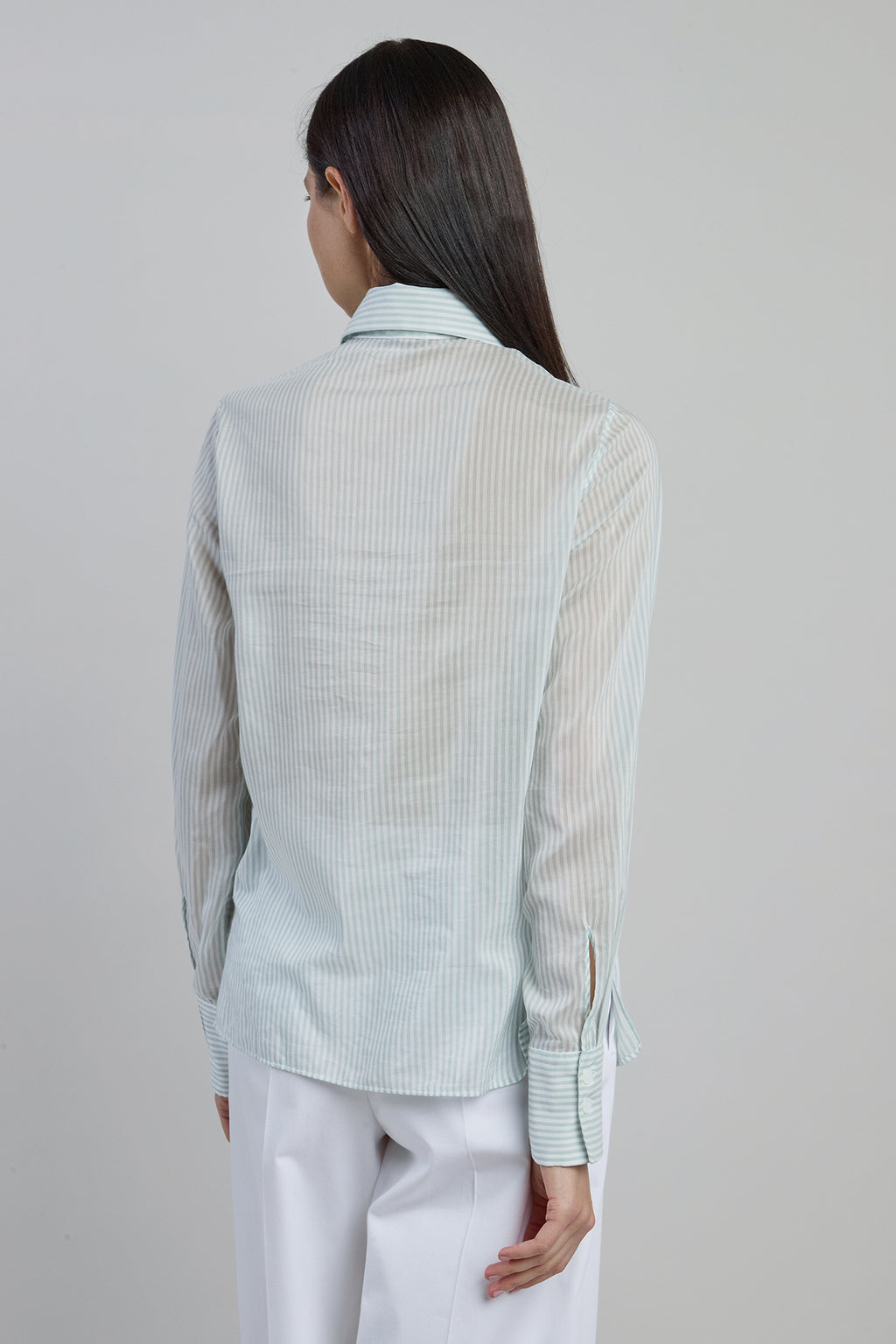 Camicia classica con collo francese, realizzata in un pregiato tessuto rigato di voile in seta e cotone. La leggerezza di questo tessuto conferisce al capo un aspetto elegante, femminile e prezioso.