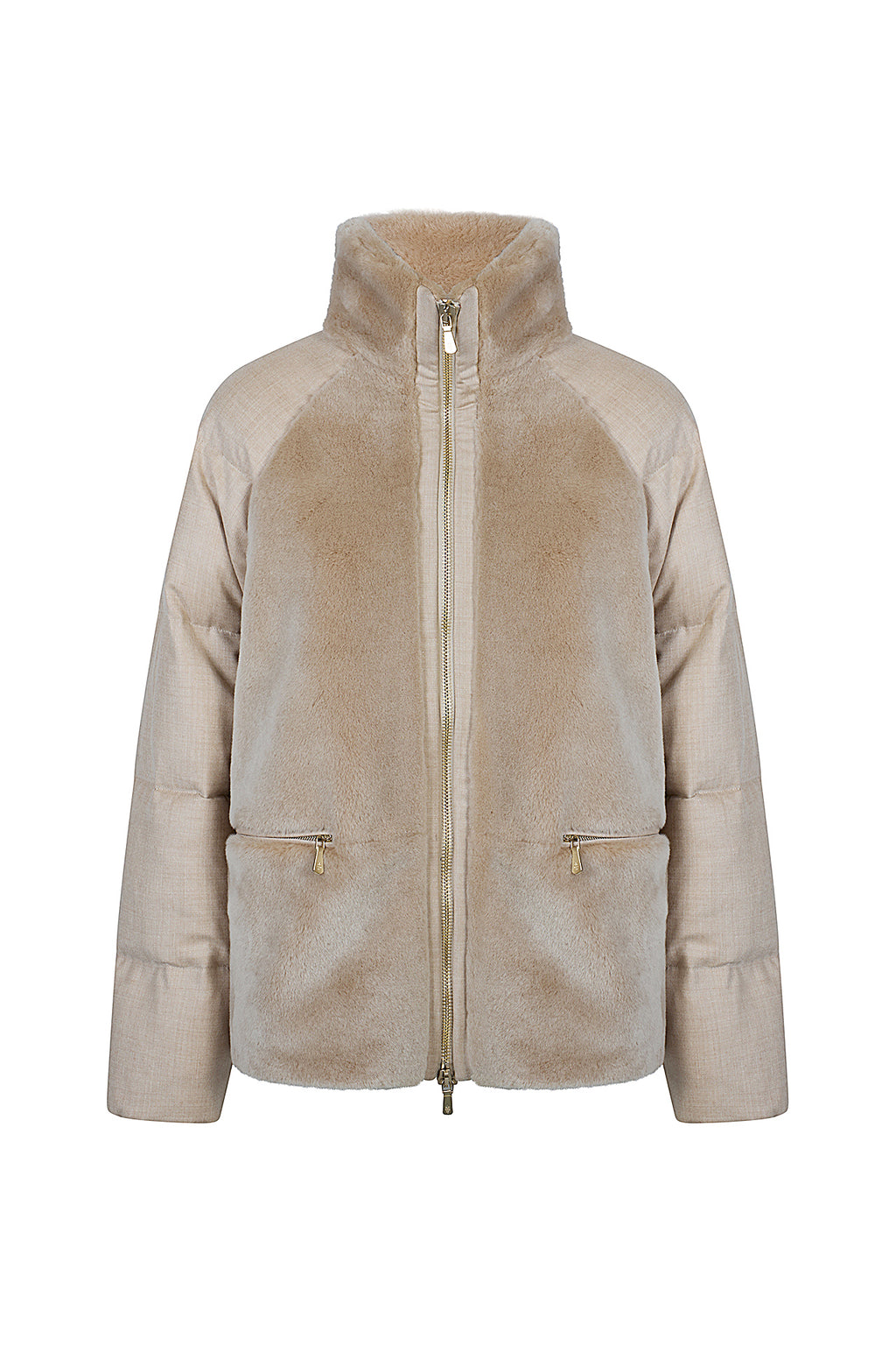 Bomber bimaterico in merino brise, realizzato con una qualità molto pregiata di montone tinto pelle nei colori della collezione. Il capo è abbinato con un tessuto di lana finissima lavorata in trama e impreziosita con un filo di lurex.