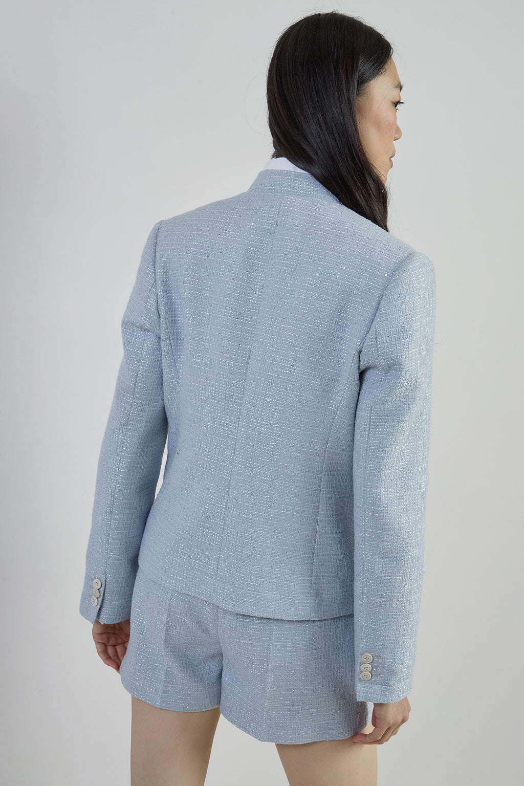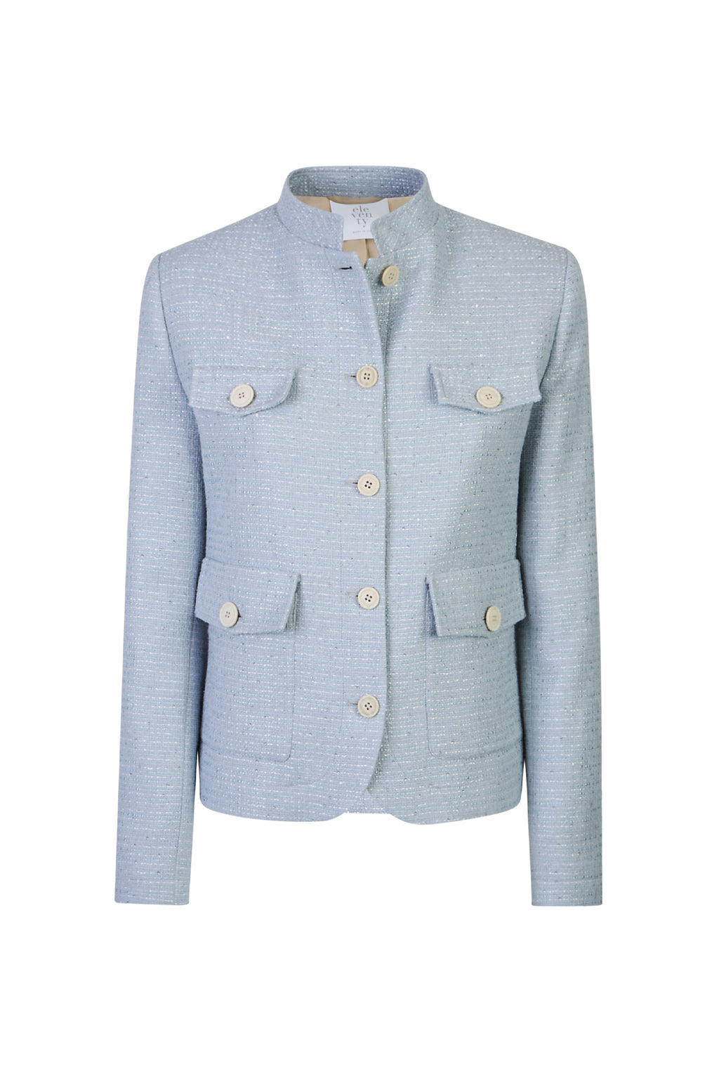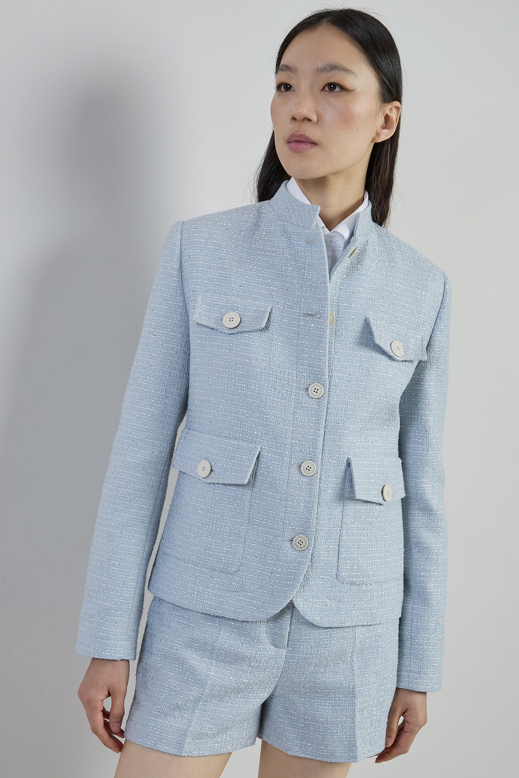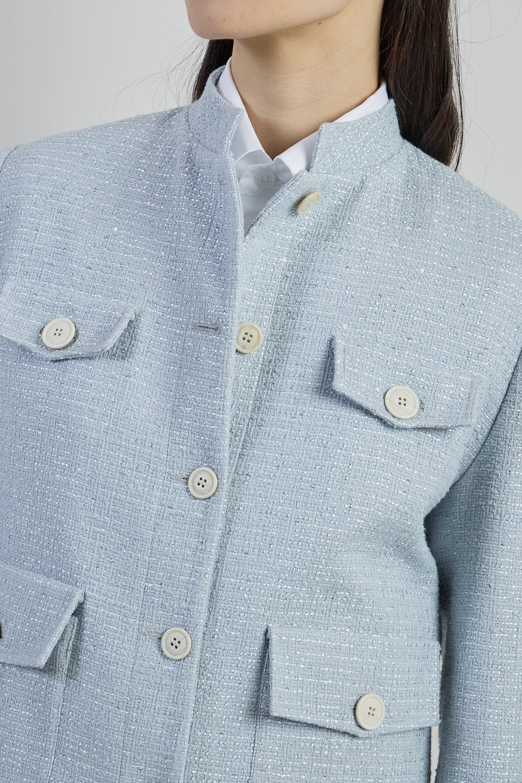 Field jacket, realizzata in tessuto di cotone armaturato con effetto bouclé, arricchita da paillettes che conferiscono al capo un tocco femminile e prezioso. Perfetta per molteplici occasioni, questa giacca unisce eleganza e versatilità.