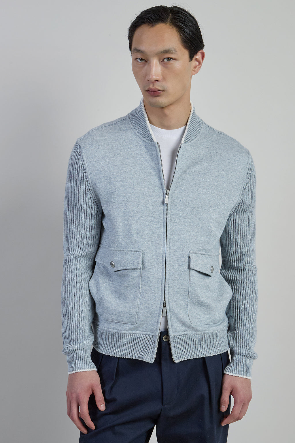 Bomber bimaterico full zip. Corpo in jersey di cotone e lino, con maniche in filato di cotone e lino a costa inglese finezza 7. L'elasticità della maglia conferisce al capo una vestibilità che si adatta a qualsiasi corporatura.Composizione