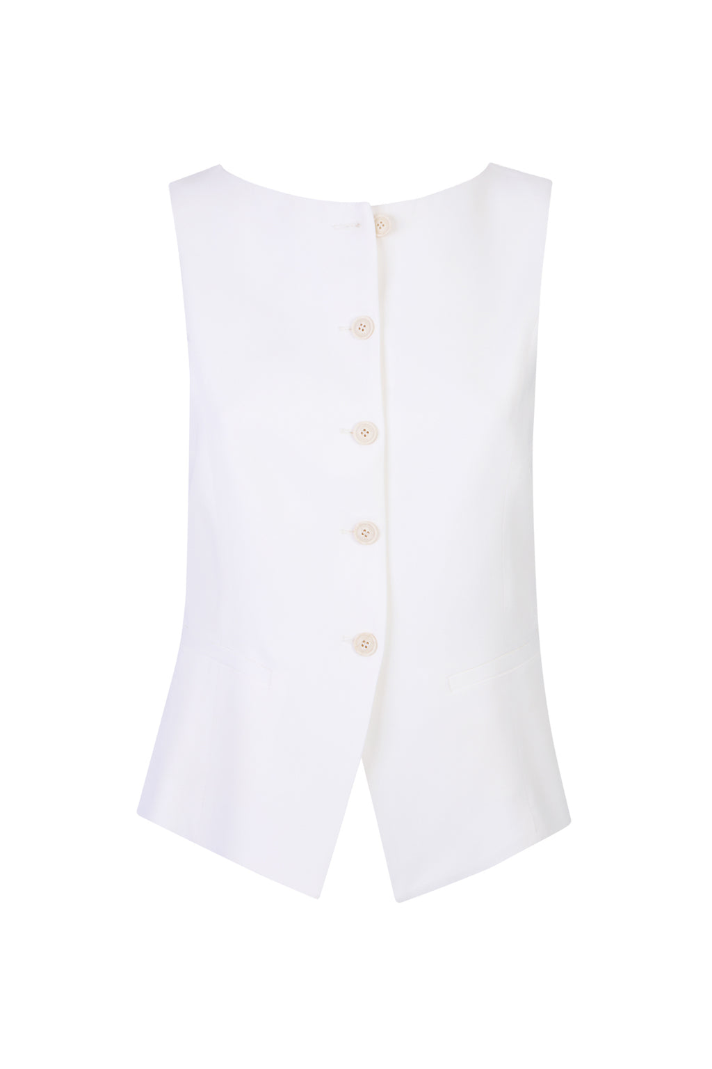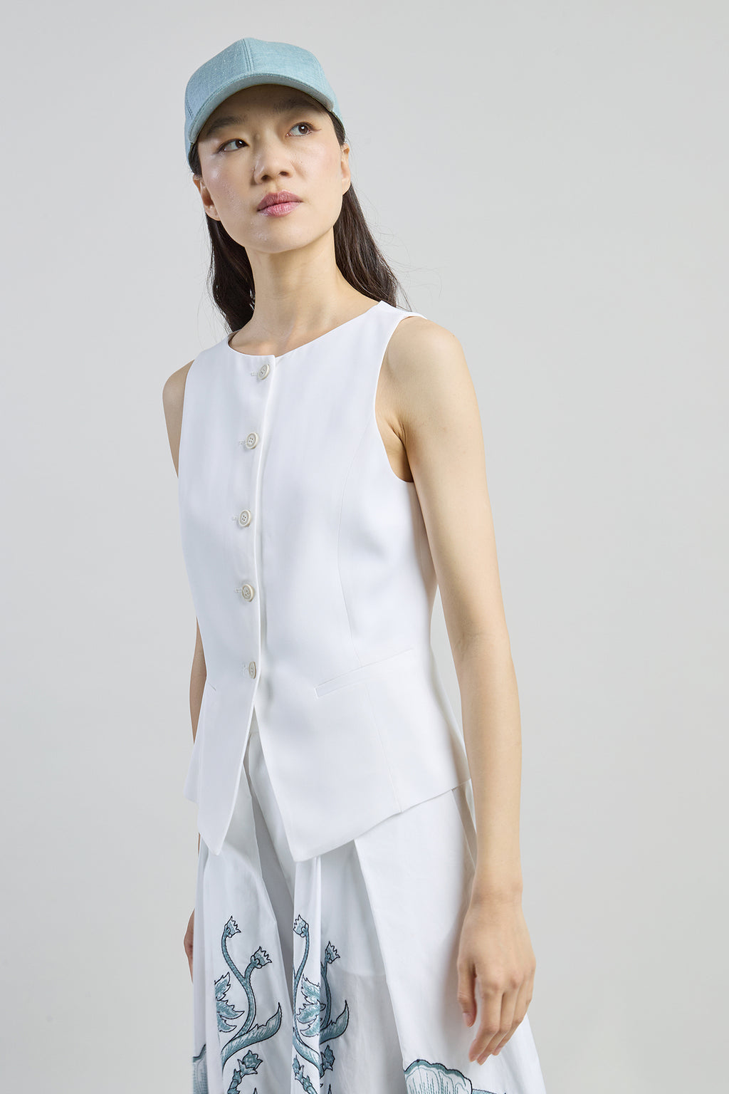 Gilet scollo a barca con bottoni, realizzato in un tessuto 100% viscosa con armatura diagonale che conferisce al materiale una combinazione di compattezza e fluidità. Questo gilet è ideale per aggiungere un tocco di eleganza e versatilità al tuo look, perfetto per ogni occasione.