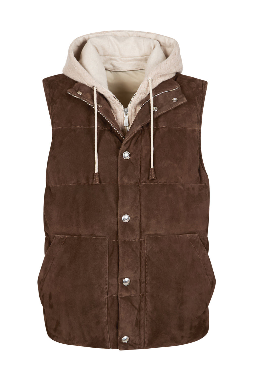 Gilet imbottito dalla vestibilità regolare, realizzato in vellutato suede. La calda imbottitura in piuma rende il capo ideale per la stagione invernale. Completa il capo la pettorina staccabile con cappuccio in jersey di lana e cashmere a treccia.Ti potrebbe piacere
