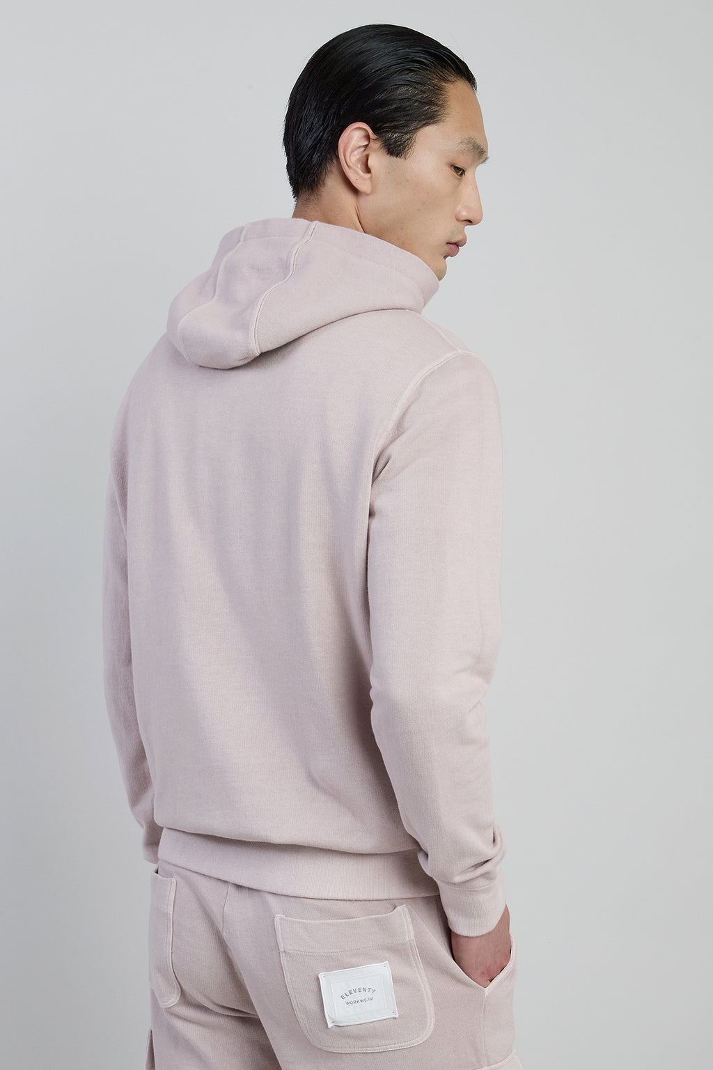 Felpa con cappuccio dalla vestibilità regolare, realizzata in jersey di cotone tinto in capo. La tintura in capo enfatizza l'aspetto artigianale della felpa, creando giochi di colore in corrispondenza delle cuciture. Capo dal design sportivo, con stampa sul cuore.Composizione