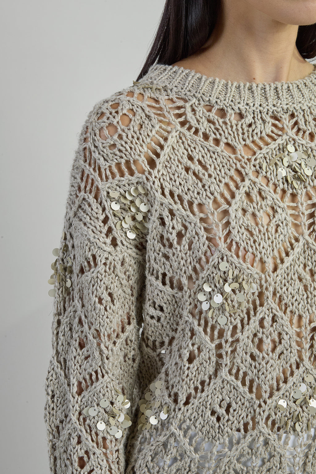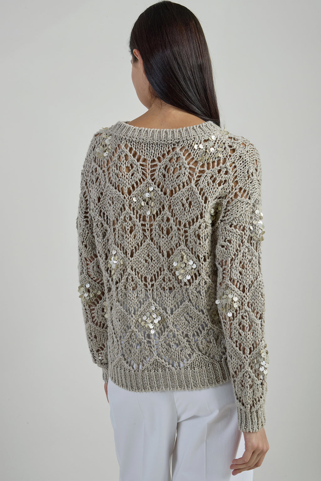 Maglia girocollo con punto a costa piatta scaricato, realizzata con un particolare filato grezzo in 100% lino naturale su finezza 3. Questa esclusiva maglia, lavorata e ricamata con fili di paillettes cuciti a mano, rappresenta l'eccellenza della nostra tradizione manifatturiera italiana.
