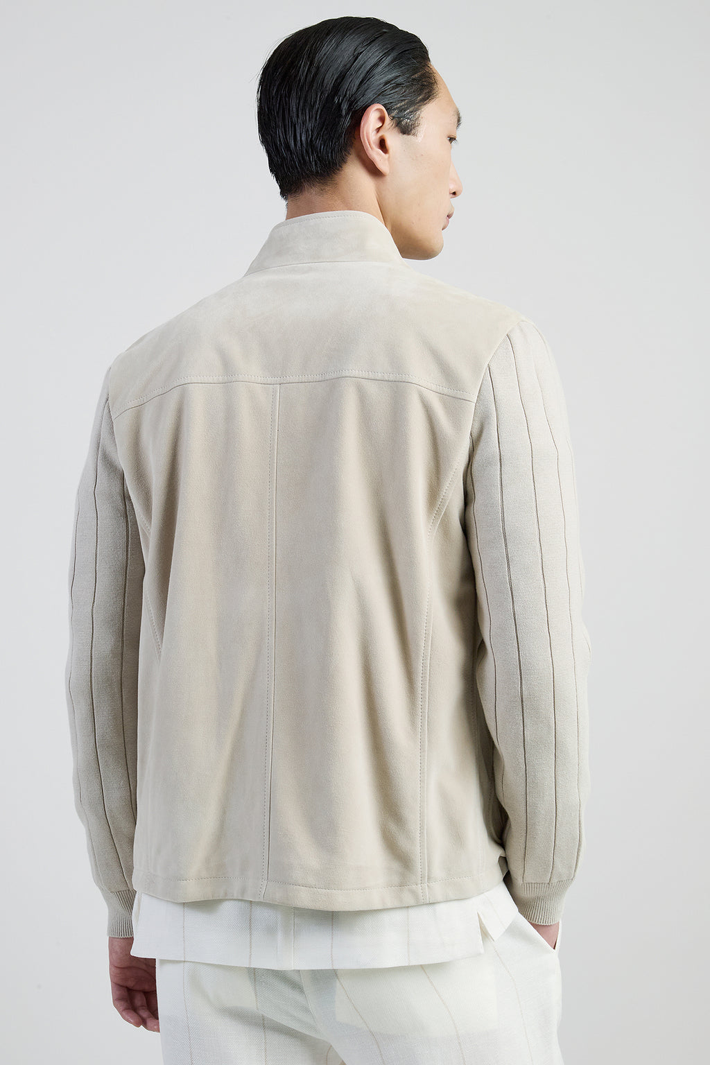 Giubbino bimaterico dalla vestibilità regolare, realizzato in vellutato suede con maniche in maglia di cotone lavorata a coste. Capo dal sapore sportivo, con dettagli d'ispirazione college.