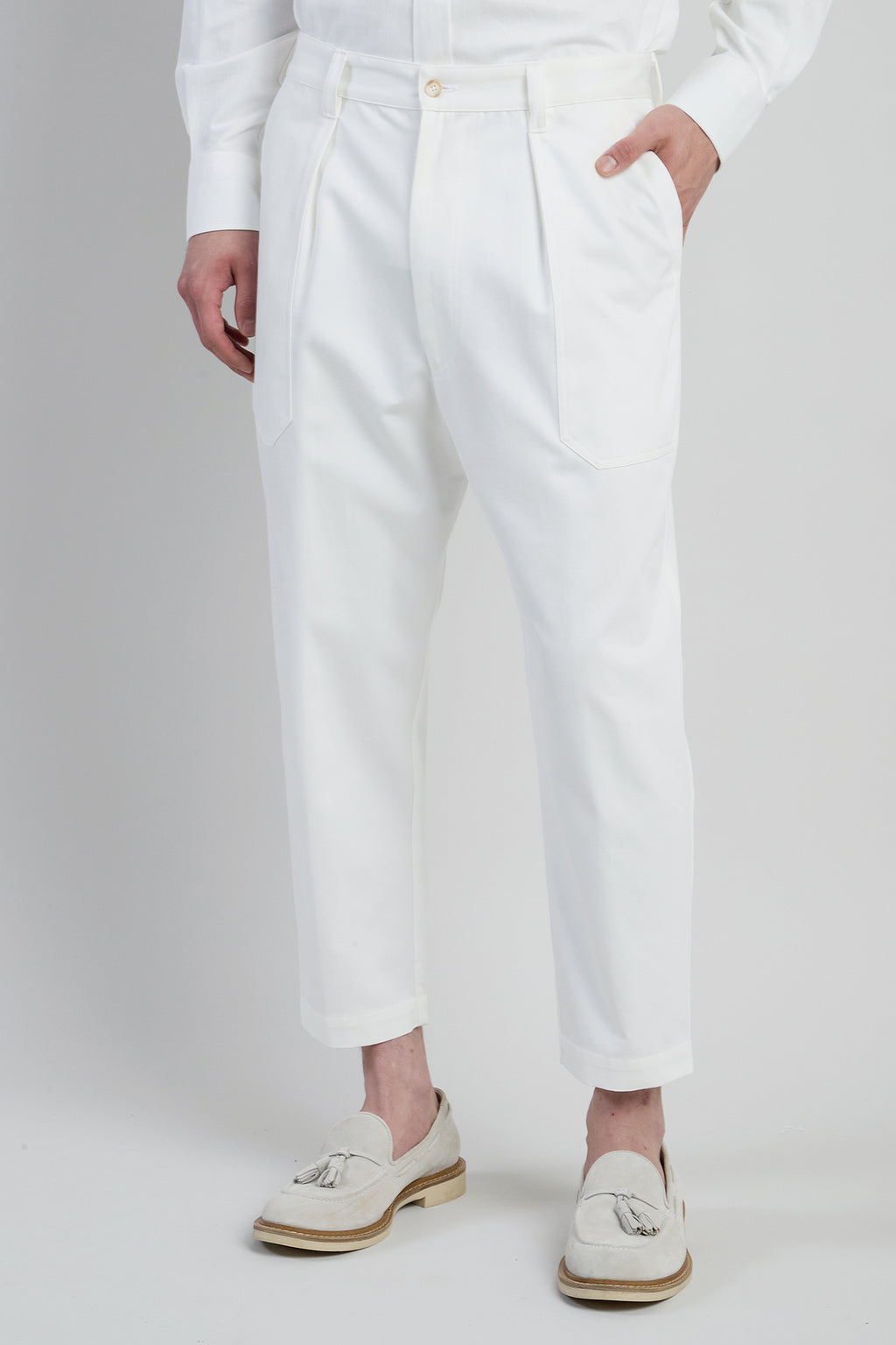 Pantalone in cotone con pinces, dalla vestibilità rilassata. Ampie tasche e dettagli dal sapore sportivo.
