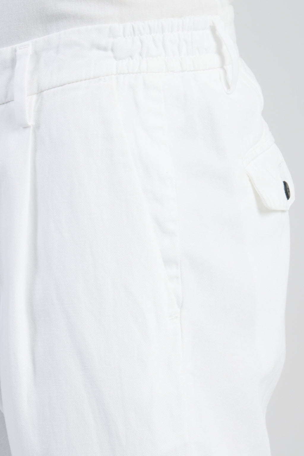 Pantalone chino in cotone lino tinto in capo, dalla vestibilità rilassata. Il trattamento di tintura, accentua le sfumature di colore in prossimità delle cuciture conferendone un aspetto vissuto. Elastico in vita in corrispondenza dei fianchi.