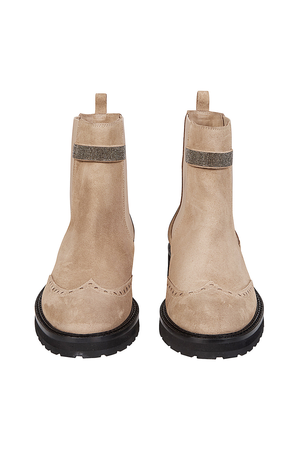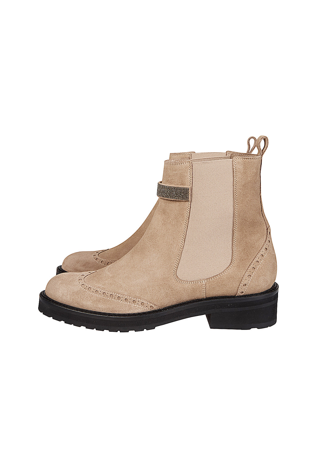 Scarpa beatles punta fiore, realizzata in suede spazzolato e resa particolare da un piccolo dettaglio in strass che dona alla scarpa un tocco femminile.
