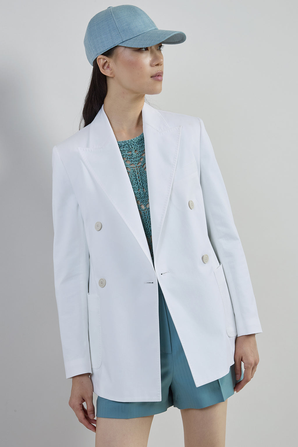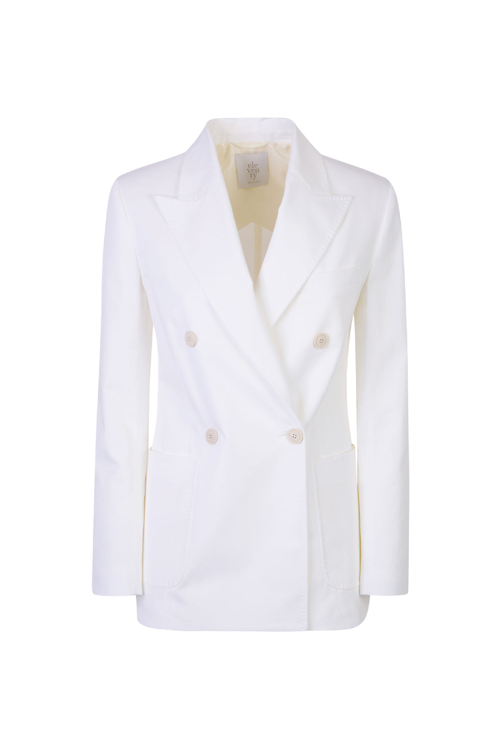 Giacca doppio petto a 4 bottoni con tasche a toppa e impuntura sartoriale MF, realizzata in tessuto 100% cotone elasticizzato. Un capo elegante e raffinato, perfetto per chi cerca uno stile distintivo e sofisticato.