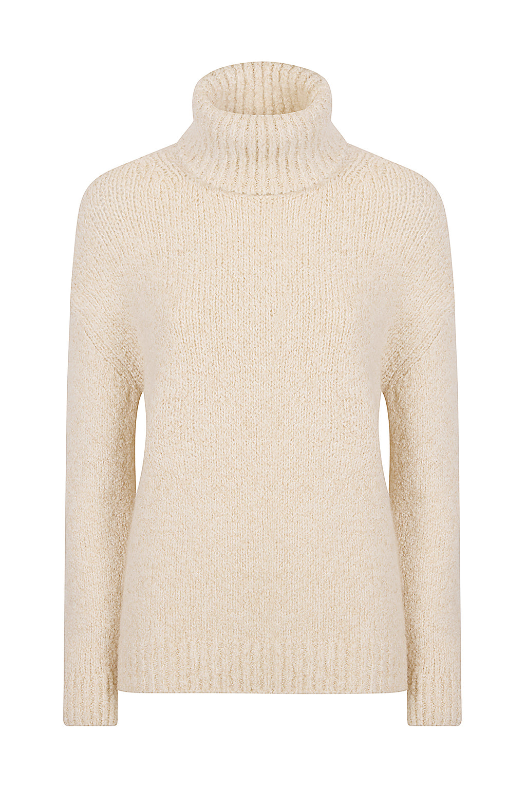 Mock turtleneck jumper made from an exclusive blend of alpaca and wool, further embellished with micro lurex inserts. This garment is ideal for wearing under coats.