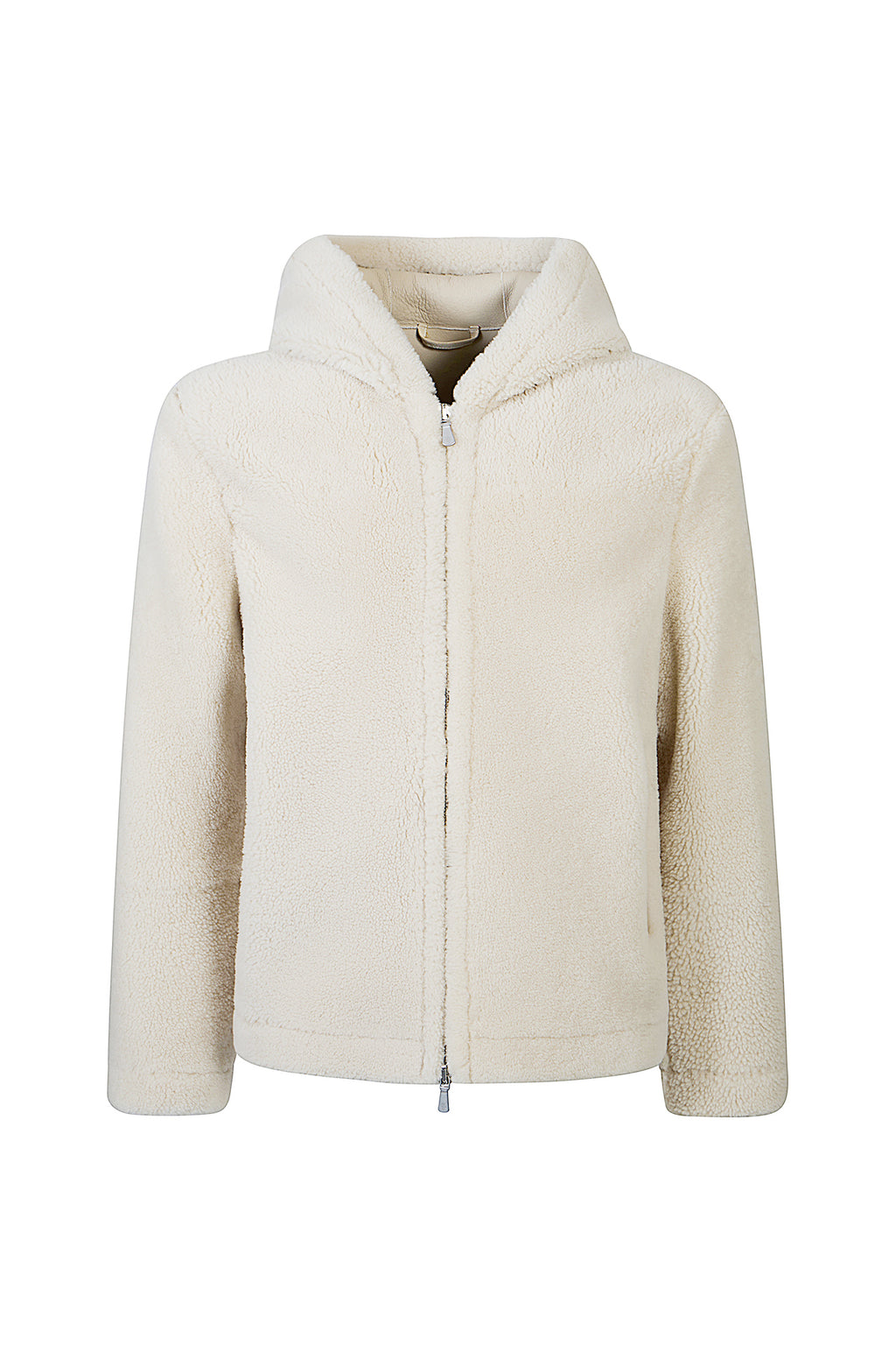 Hooded jacket with a regular fit, made of overturned shearling. Full zip chief with a sporty flavor with lips, pockets and wrists in tonal leather.