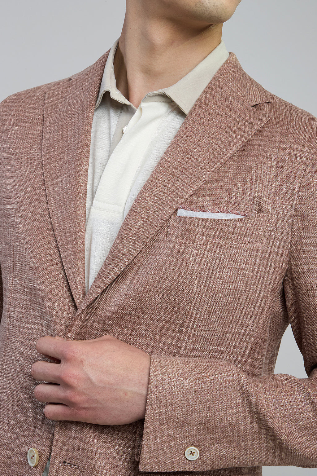 Giacca monopetto soft destrutturata prodotta con pregiato tessuto di lino lana e seta di Lanificio Ermenegildo Zegna, dalla vestibilità slim. Realizzata interamente in Italia con passaggi a mano che richiedono circa dieci ore di lavorazione, la giacca è caratterizzata da un bottone singolo sulla manica, segno distintivo del brand, ispirato alla tradizione della sartoria napoletana.Composizione