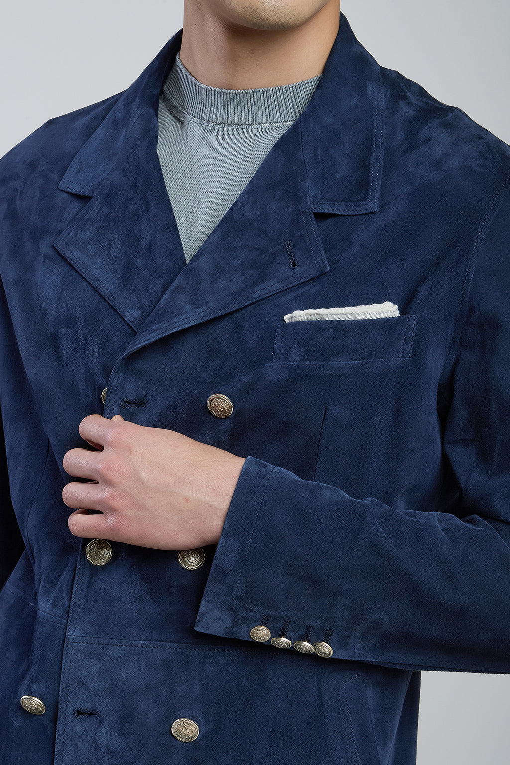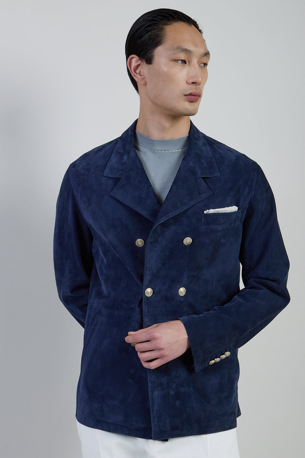 Unlined double-breasted jacket made of suede velvet. Tailored from an exceptionally lightweight leather with a soft, velvety texture, this jacket is embellished with metal buttons and offers a regular fit.