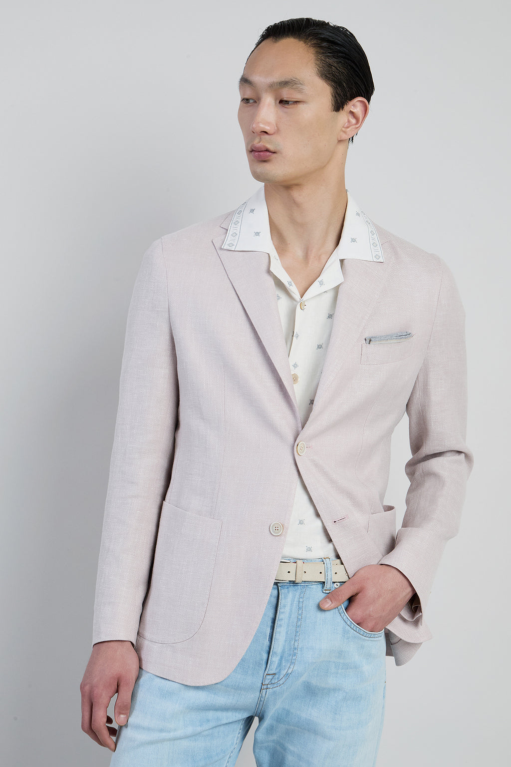 Giacca monopetto soft destrutturata prodotta con pregiato tessuto di lino, lana e seta di Lanificio Ermenegildo Zegna, dalla vestibilità slim. Realizzata interamente in Italia con passaggi a mano che richiedono circa dieci ore di lavorazione, la giacca è caratterizzata da un bottone singolo sulla manica, segno distintivo del brand, ispirato alla tradizione della sartoria napoletana.