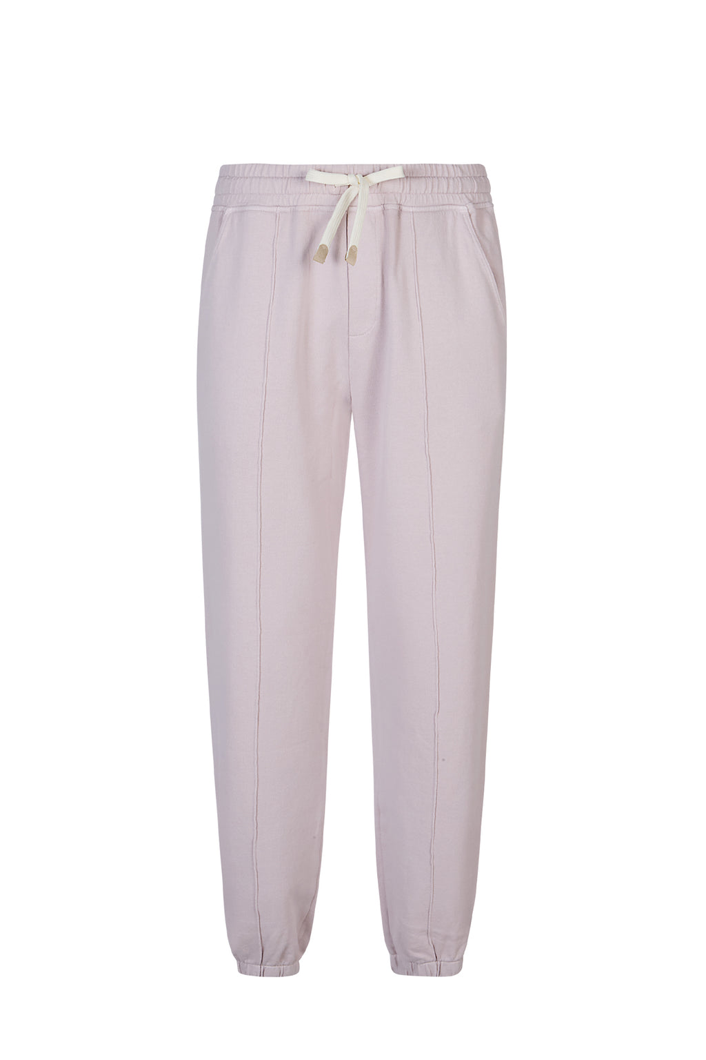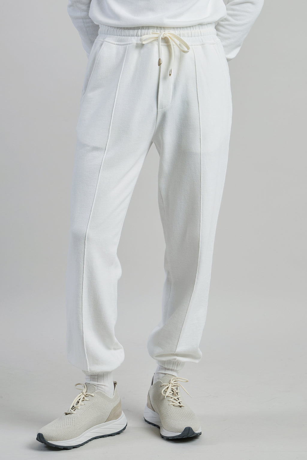 The refined texture of garment-dyed cotton characterizes these men's trousers, offering a sophisticated take on modern leisurewear through a tailored silhouette. Crafted from premium cotton jersey, these regular fit pants feature elegant front pleats and functional slash pockets, blending casual comfort with an artisanal aesthetic. The unique dyeing process creates subtle color variations along the seams, highlighting the high-quality sweatshirt fabric. Designed with a focus on versatility, the pure cotton construction ensures maximum breathability throughout the day. Details like the internal drawstring and precise finishing reflect authentic Italian craftsmanship, making this garment a fundamental piece for a contemporary and relaxed wardrobe.