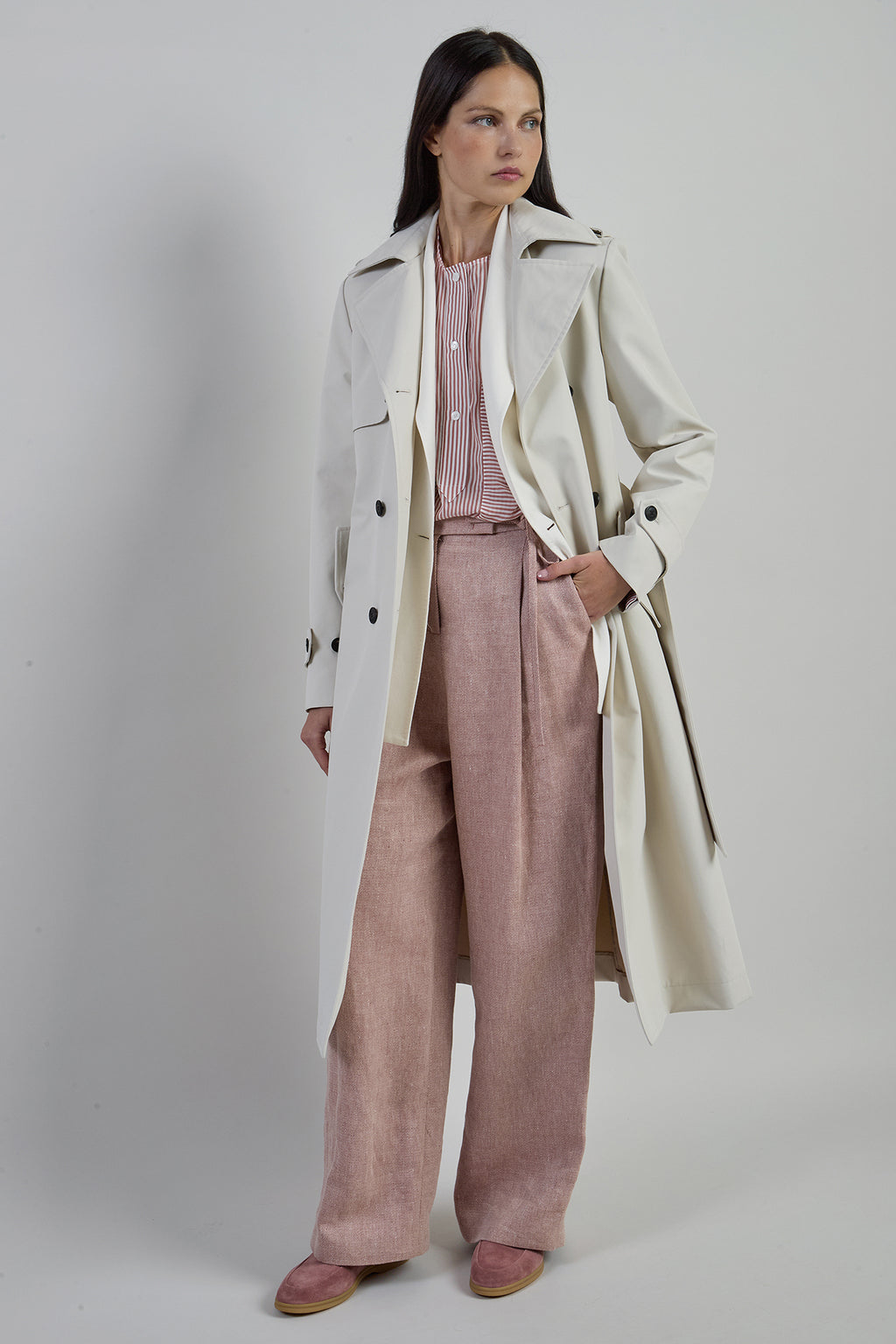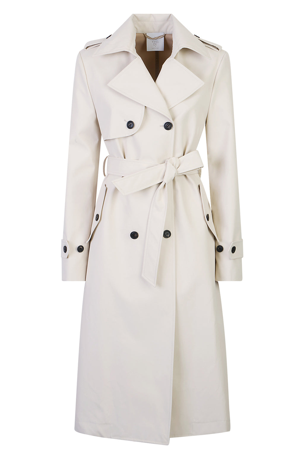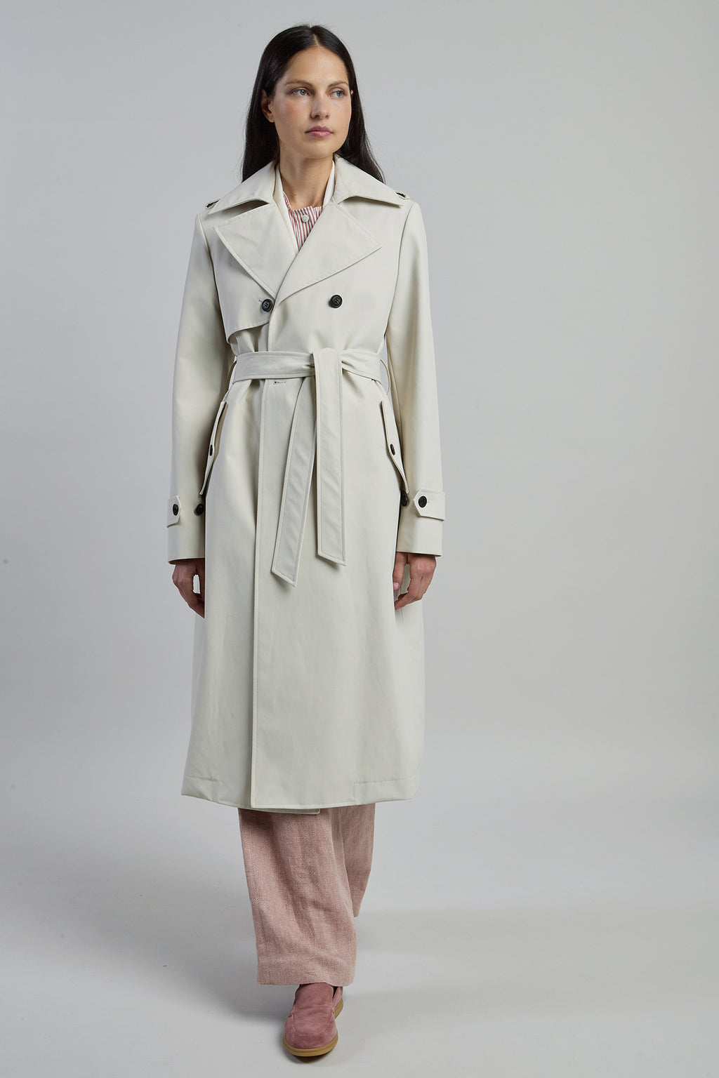 Long trench coat with a belt, made from water-resistant double-sided nylon, making it perfect for rainy and windy days.