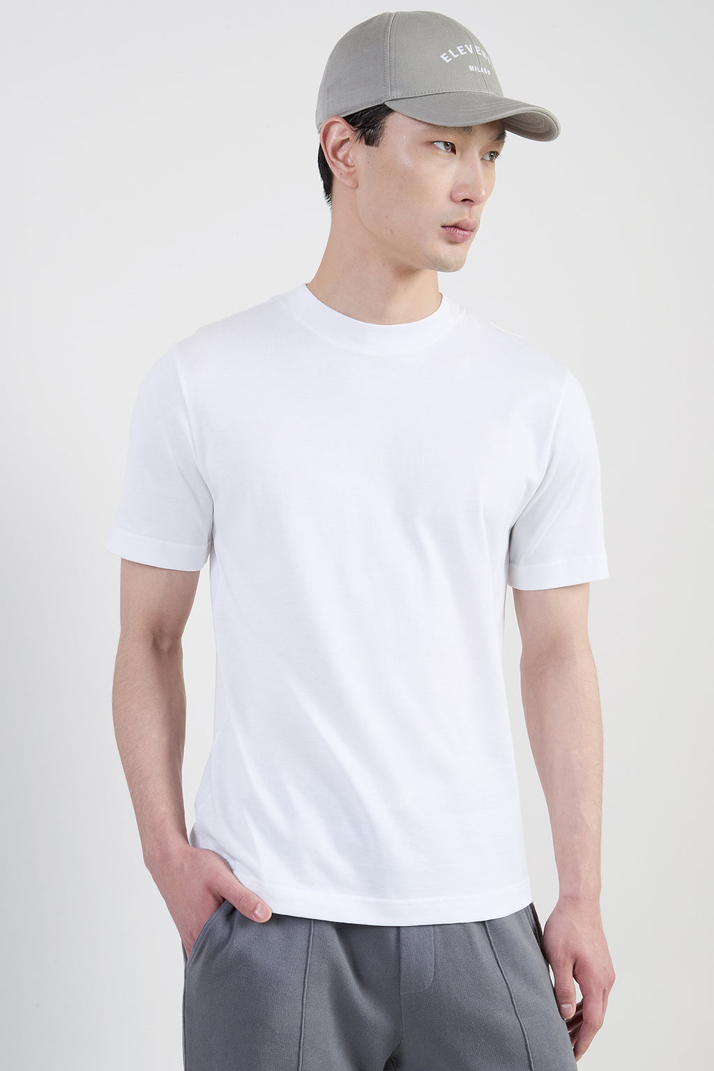 Regular-fit short-sleeve crew-neck T-shirt featuring a 3 cm high-neck collar. It is made from Giza cotton jersey, celebrated for its exceptional strength, brilliance, and remarkable softness. Giza cotton is a rare and exclusive fibre harvested in certain areas of the Nile Delta and renowned as the finest cotton fibre in the world. The exclusivity of this product lies in the limited availability of the fibres entailing high seeding and harvesting costs.
