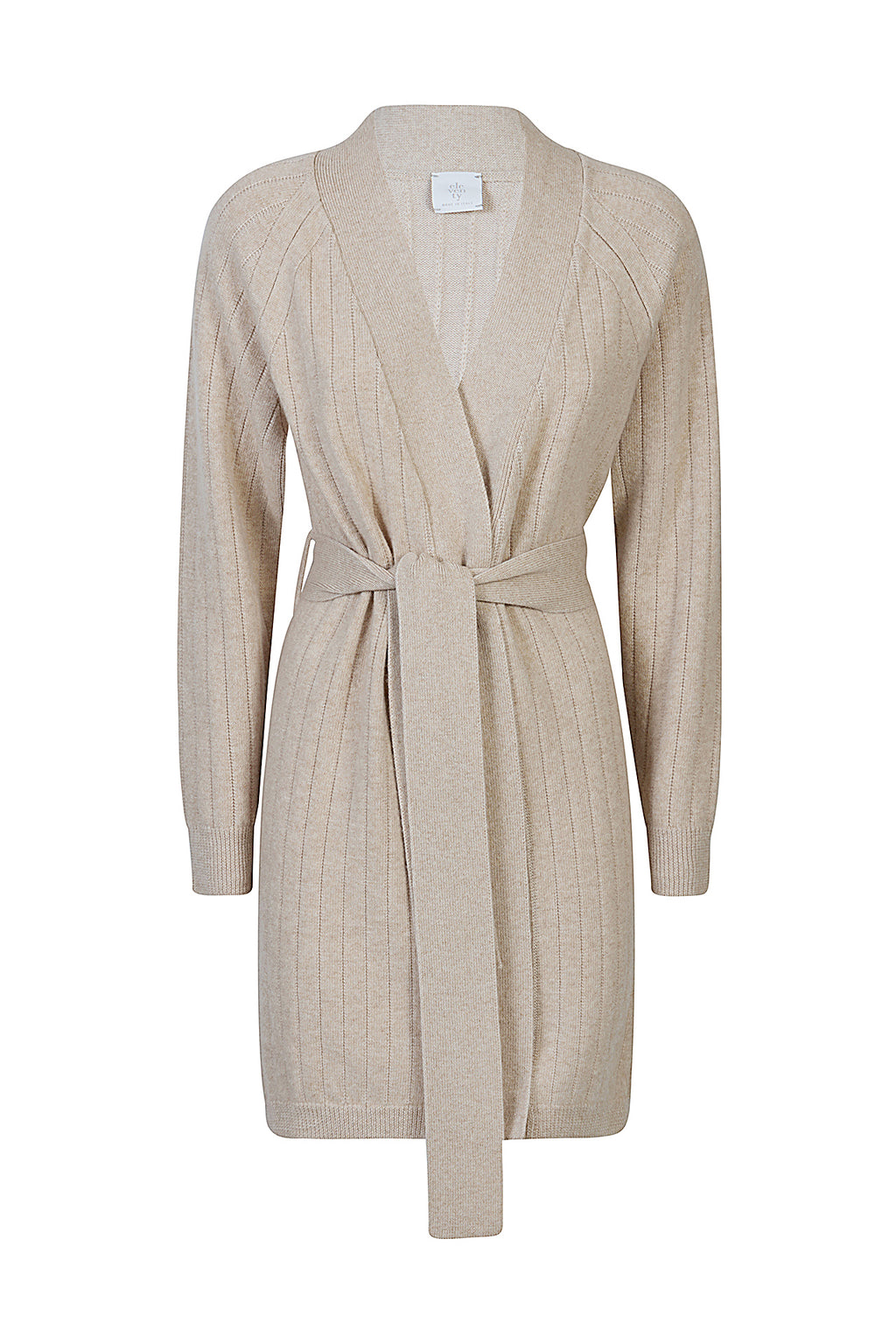 Knitted cardigan with belt, gauge 7, crafted from a cashmere and wool blend with drop needle rib knit. The weight of this garment makes it ideal for the beginning of the winter season, serving perfectly as a jacket in place of a coat.