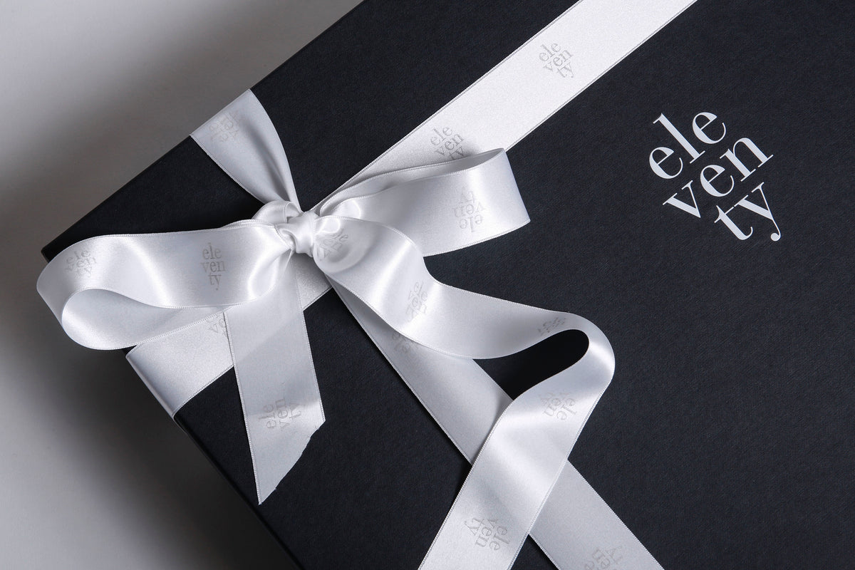 Il nastro Eleventy in doppio raso di seta personalizzato, viene annodato con un fiocco in alto a sinistra a chiudere la scatola, conferendo personalità al brand.